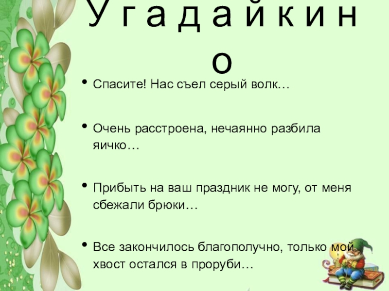 У г а д а й к и н оСпасите! Нас съел серый волк…Очень расстроена, нечаянно разбила яичко…Прибыть на ваш праздник не могу, от меня сбежали брюки…Все закончилось благополучно, только мой хвост остался в проруби…