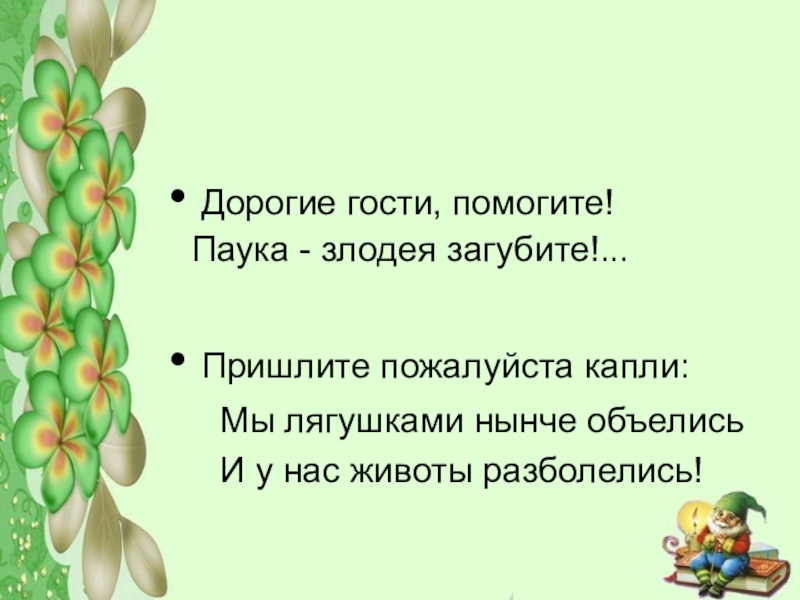 Слайд 3 Дорогие гости, помогите! Паука - злодея загубите!...