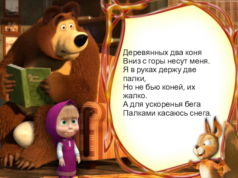 Слайд 6Деревянных два коня Вниз с горы несут меня. Я в руках держу две