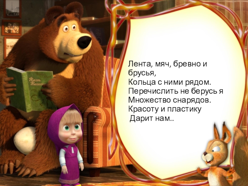 Слайд 18Лента, мяч, бревно и брусья, Кольца с ними рядом. Перечислить не