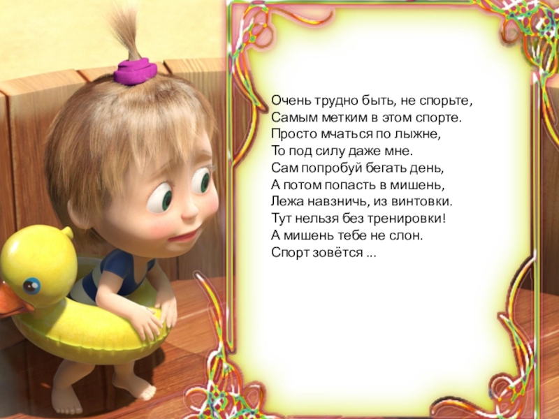 мчаться по лыжне, То под силу даже мне. Сам попробуй бегать день, А потом попасть в мишень, Лежа навзничь, из винтовки. Тут нельзя без тренировки! А мишень тебе не слон. Спорт зовётся ...