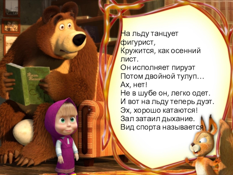 Слайд 14На льду танцует фигурист, Кружится, как осенний лист. Он исполняет пируэт Потом двойной тулуп…
