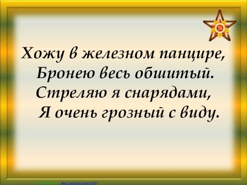 Слайд 7Хожу в железном панцире, Бронею весь обшитый. Стреляю я снарядами, Я