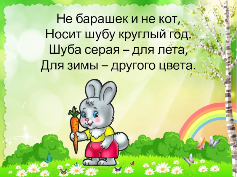 Не барашек и не кот, Носит шубу круглый год. Шуба серая – для лета, Для зимы –