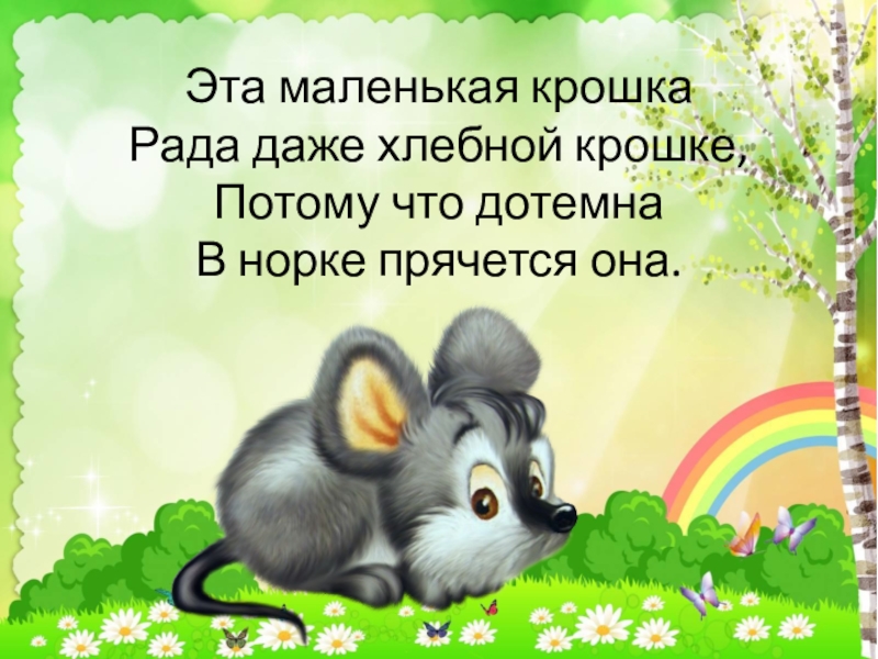Слайд 9Эта маленькая крошка Рада даже хлебной крошке, Потому что дотемна В норке прячется она.