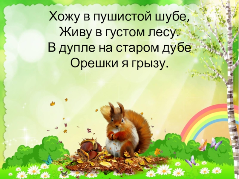 Хожу в пушистой шубе, Живу в густом лесу. В дупле на старом дубе Орешки я грызу.