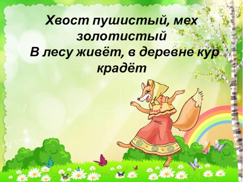 Слайд 4Хвост пушистый, мех золотистый В лесу живёт, в деревне кур крадёт