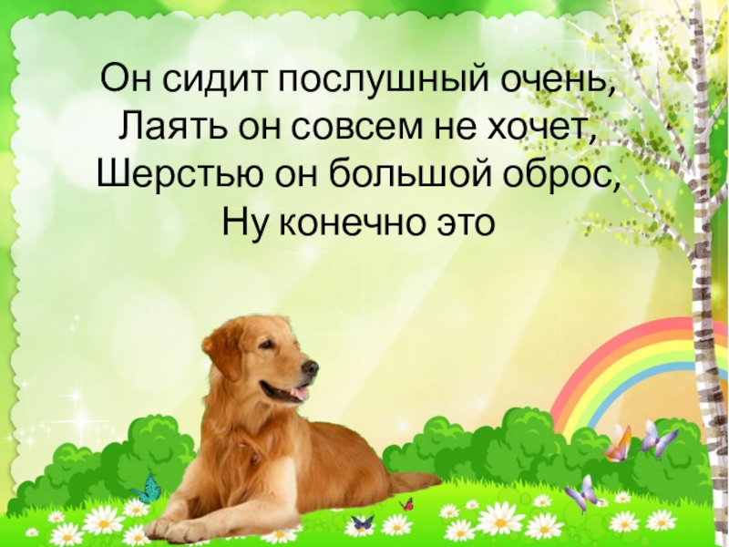 Слайд 6Он сидит послушный очень, Лаять он совсем не хочет, Шерстью он большой оброс, Ну
