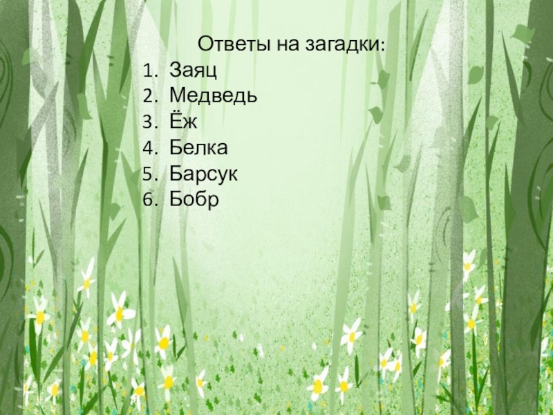 Ответы на загадки:ЗаяцМедведьЁжБелкаБарсукБобр