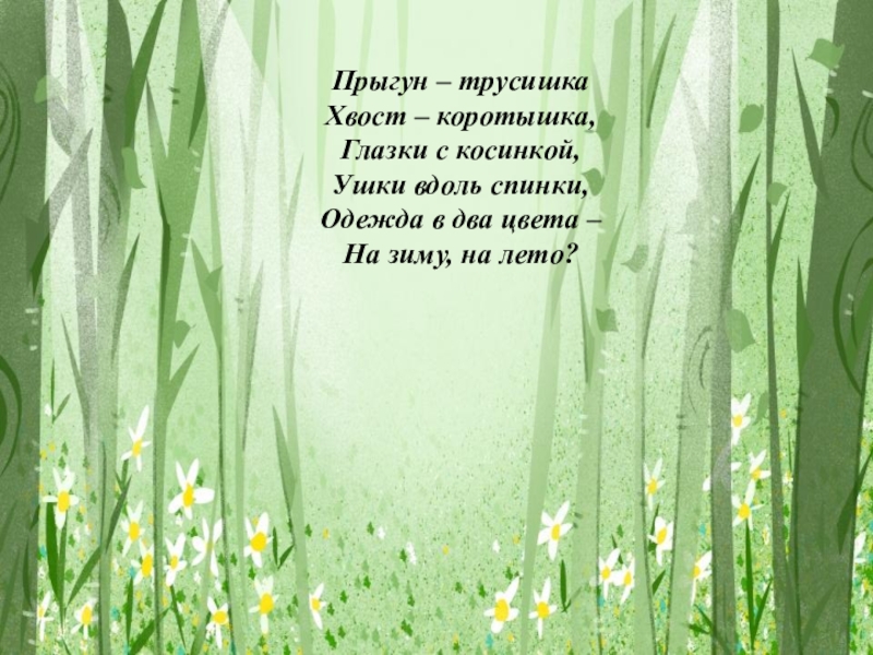 Прыгун – трусишкаХвост – коротышка,Глазки с косинкой, Ушки вдоль спинки,Одежда в два цвета – На зиму, на лето?