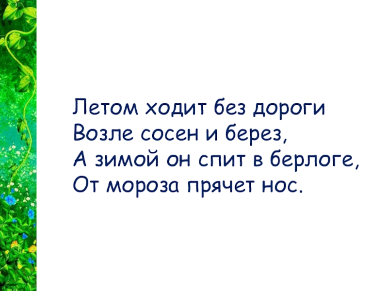 Летом ходит без дорогиВозле сосен и берез,А зимой он спит в берлоге,От мороза прячет нос.