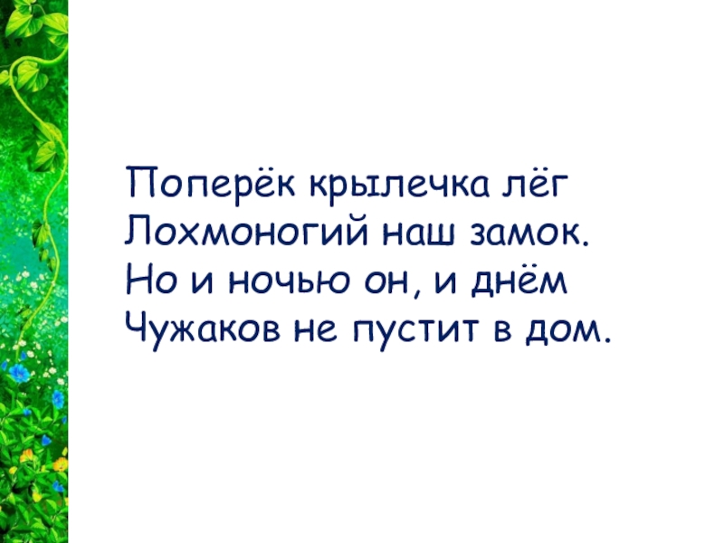 Поперёк крылечка лёгЛохмоногий наш замок.Но и ночью он, и днёмЧужаков не пустит в дом.