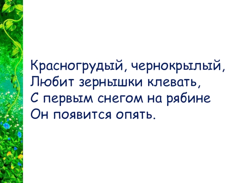 Красногрудый, чернокрылый,Любит зернышки клевать,С первым снегом на рябинеОн появится опять.