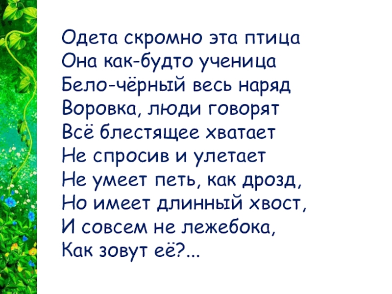 Одета скромно эта птицаОна как-будто ученицаБело-чёрный весь нарядВоровка, люди говорятВсё блестящее хватаетНе спросив и улетаетНе умеет петь,