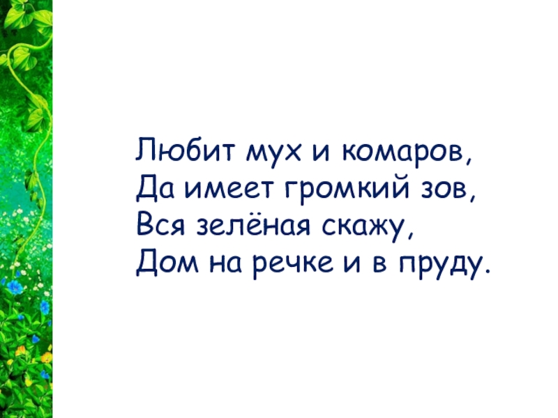 Любит мух и комаров,Да имеет громкий зов,Вся зелёная скажу,Дом на речке и в пруду.