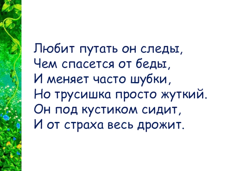 Любит путать он следы,Чем спасется от беды,И меняет часто шубки,Но трусишка просто жуткий.Он под кустиком сидит,И от
