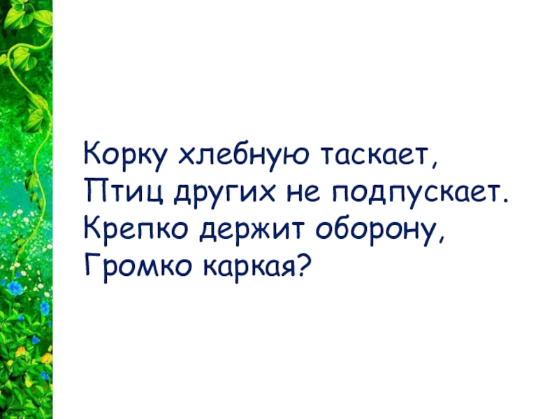 Корку хлебную таскает,Птиц других не подпускает.Крепко держит оборону,Громко каркая?