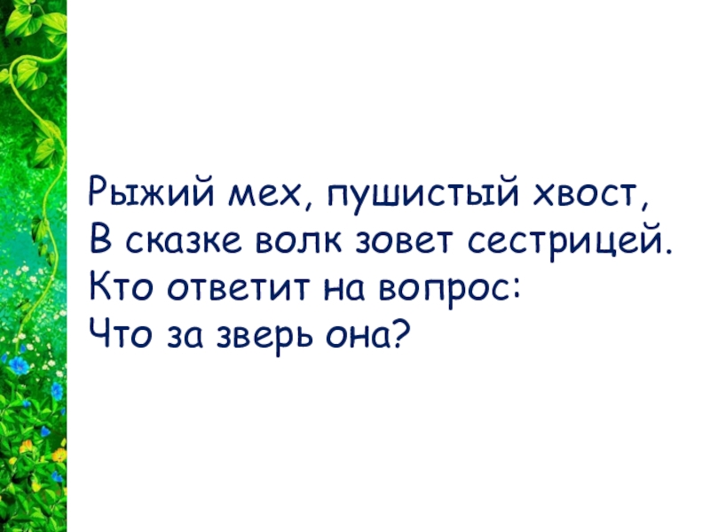 Рыжий мех, пушистый хвост,В сказке волк зовет сестрицей.Кто ответит на вопрос:Что за зверь она?