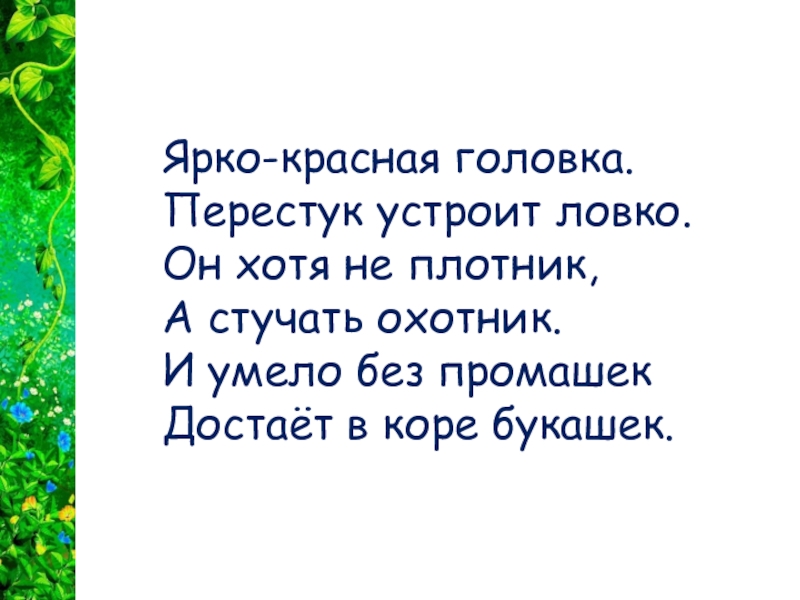 Ярко-красная головка.Перестук устроит ловко.Он хотя не плотник,А стучать охотник.И умело без промашекДостаёт в коре букашек.