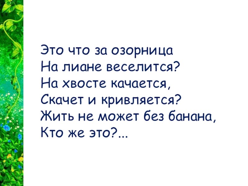 Это что за озорницаНа лиане веселится?На хвосте качается,Скачет и кривляется?Жить не может без банана,Кто же это?...