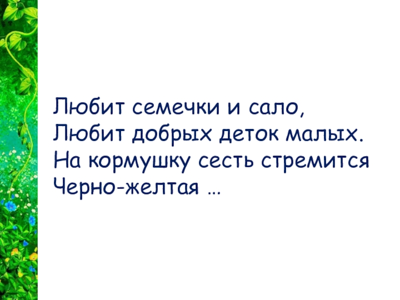 Любит семечки и сало,Любит добрых деток малых.На кормушку сесть стремитсяЧерно-желтая …