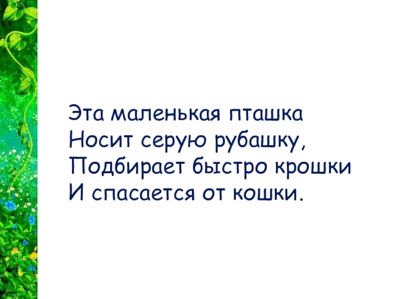 Эта маленькая пташкаНосит серую рубашку,Подбирает быстро крошкиИ спасается от кошки.