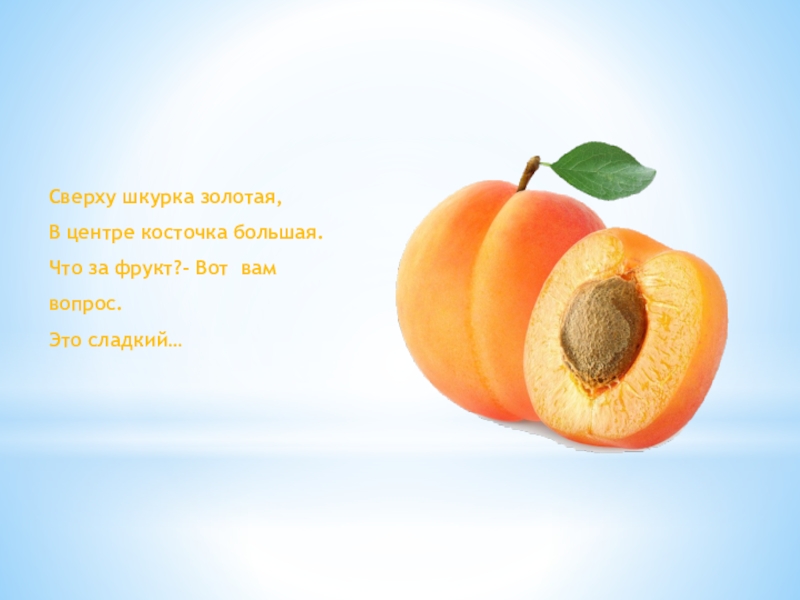 Сверху шкурка золотая,В центре косточка большая.Что за фрукт?- Вот вам вопрос.Это сладкий…