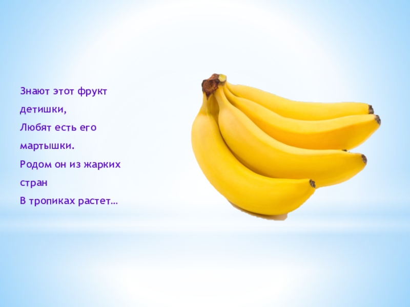 Знают этот фрукт детишки,Любят есть его мартышки.Родом он из жарких странВ тропиках растет…