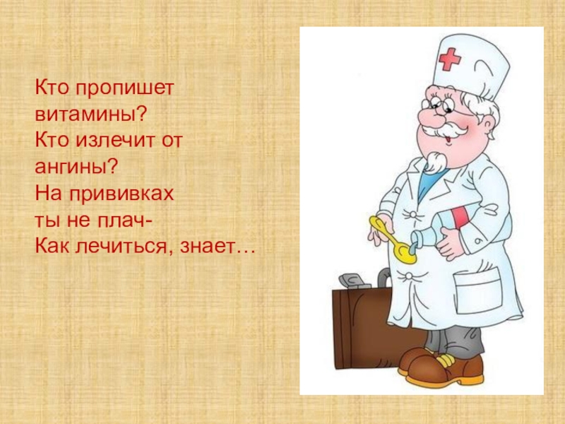 Кто пропишет витамины?Кто излечит от ангины?На прививках ты не плач-Как лечиться, знает…