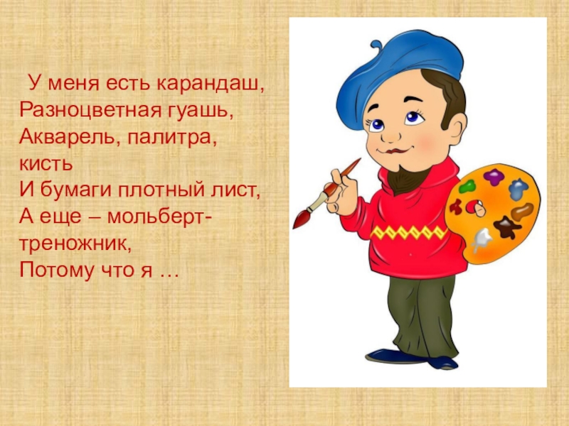 У меня есть карандаш, Разноцветная гуашь, Акварель, палитра, кисть И бумаги плотный лист, А еще – мольберт-треножник,
