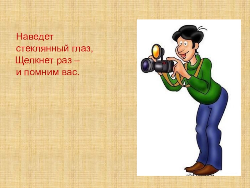Наведет стеклянный глаз,   Щелкнет раз – и помним вас.