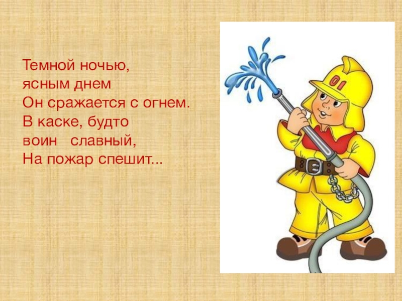 Темной ночью, ясным днемОн сражается с огнем.В каске, будто воин  славный,На пожар спешит...