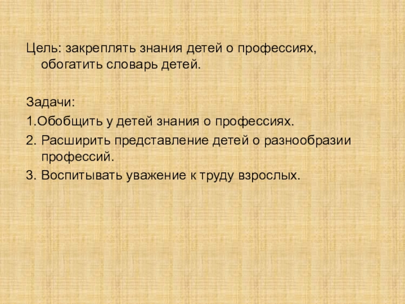 Цель: закреплять знания детей о профессиях, обогатить словарь детей. Задачи: 1.Обобщить у детей знания о профессиях.2. Расширить представление детей о разнообразии профессий.3. Воспитывать уважение к труду взрослых.