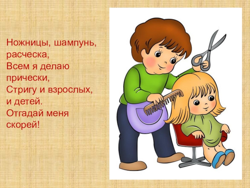 Ножницы, шампунь, расческа,  Всем я делаю прически,  Стригу и взрослых,и детей.  Отгадай меня скорей!