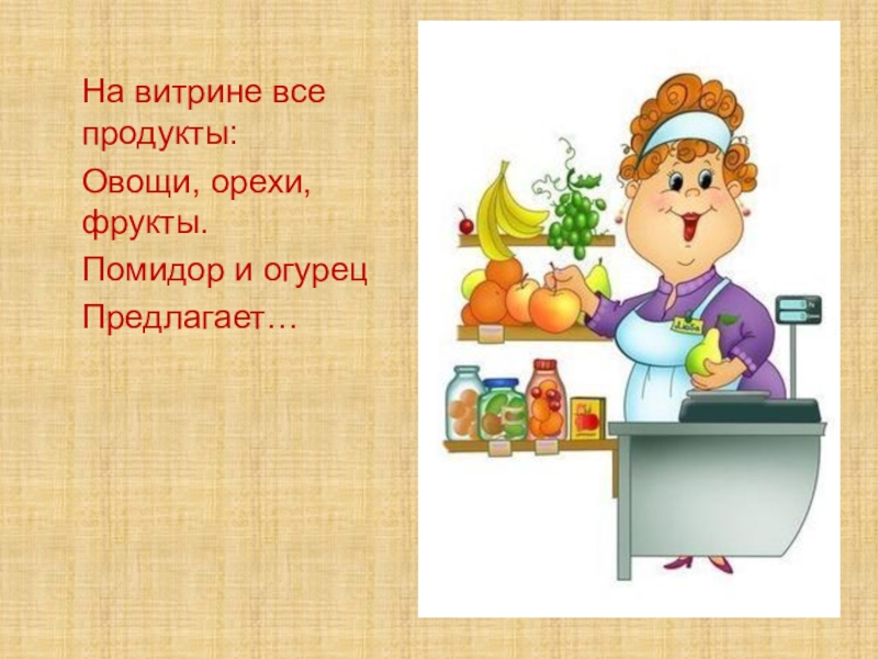 На витрине все продукты:Овощи, орехи, фрукты.Помидор и огурецПредлагает…