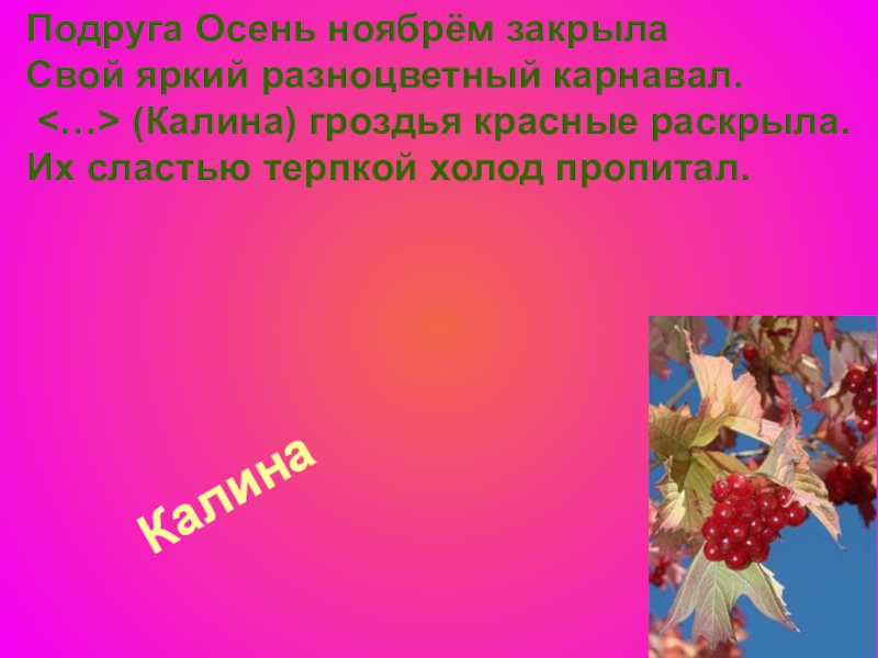 Калина Подруга Осень ноябрём закрыла Свой яркий разноцветный карнавал.  (Калина) гроздья красные раскрыла. Их сластью терпкой