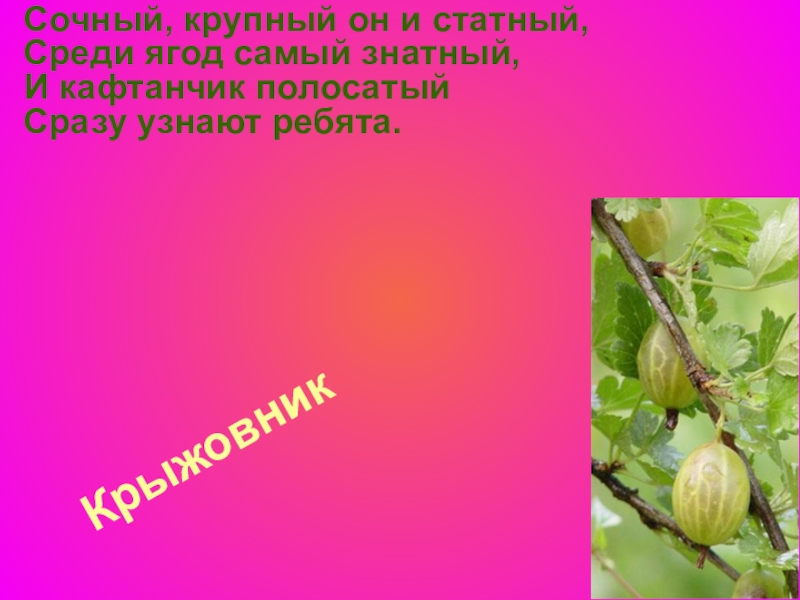 Крыжовник Сочный, крупный он и статный,  Среди ягод самый знатный,  И кафтанчик полосатый  Сразу