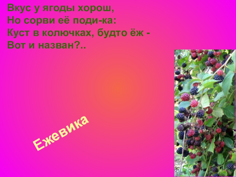 Ежевика Вкус у ягоды хорош, Но сорви её поди-ка: Куст в колючках, будто ёж - Вот и