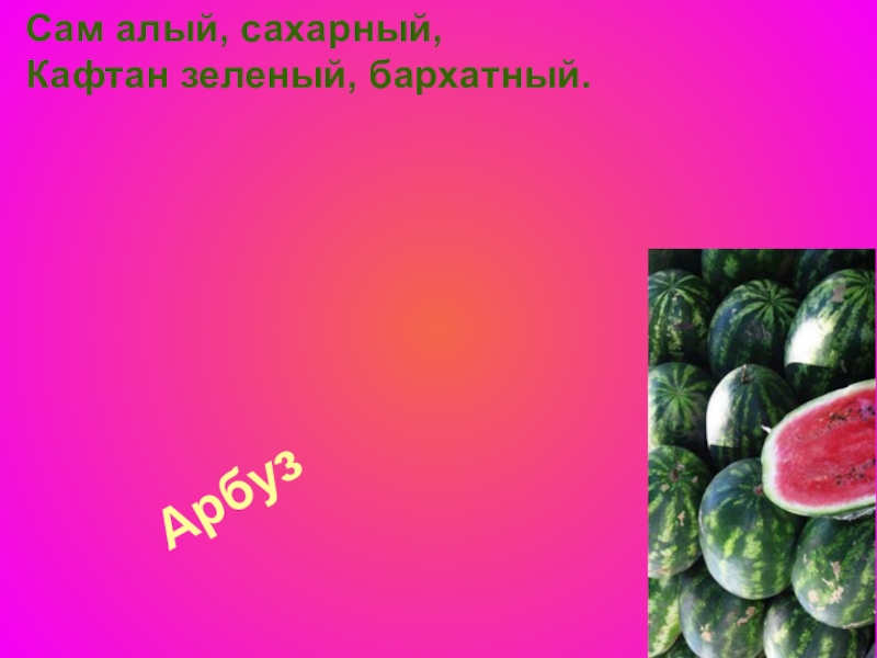 Арбуз  Сам алый, сахарный,  Кафтан зеленый, бархатный.