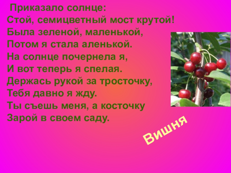 Вишня   Приказало солнце: Стой, семицветный мост крутой! Была зеленой, маленькой, Потом я стала аленькой. На