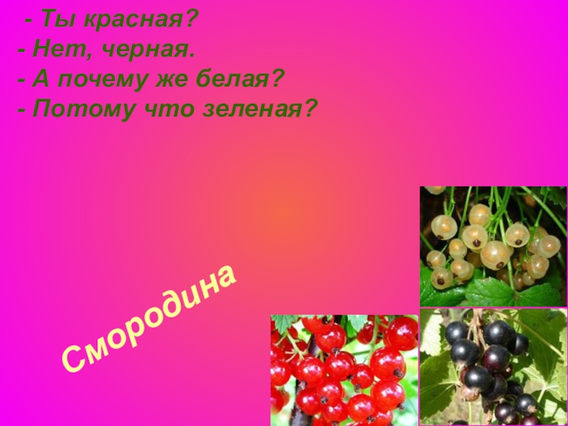 Смородина - Ты красная? - Нет, черная. - А почему же белая? - Потому что зеленая?