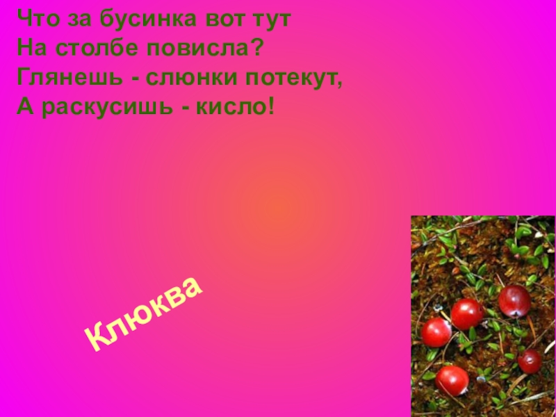 Клюква Что за бусинка вот тут На столбе повисла? Глянешь - слюнки потекут, А раскусишь - кисло!
