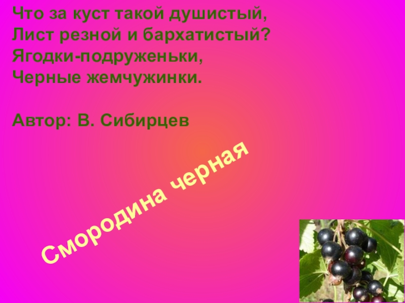 Смородина черная  Что за куст такой душистый, Лист резной и бархатистый? Ягодки-подруженьки, Черные жемчужинки.  Автор: