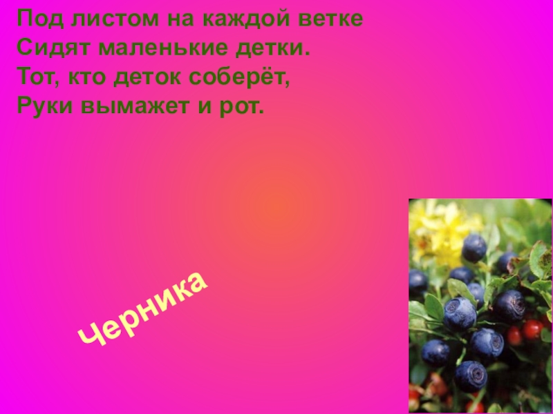 Черника Под листом на каждой ветке Сидят маленькие детки. Тот, кто деток соберёт, Руки вымажет и рот.