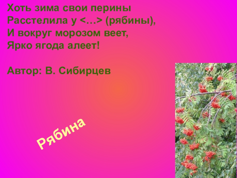 Хоть зима свои перины Расстелила у (рябины), И вокруг морозом веет, Ярко