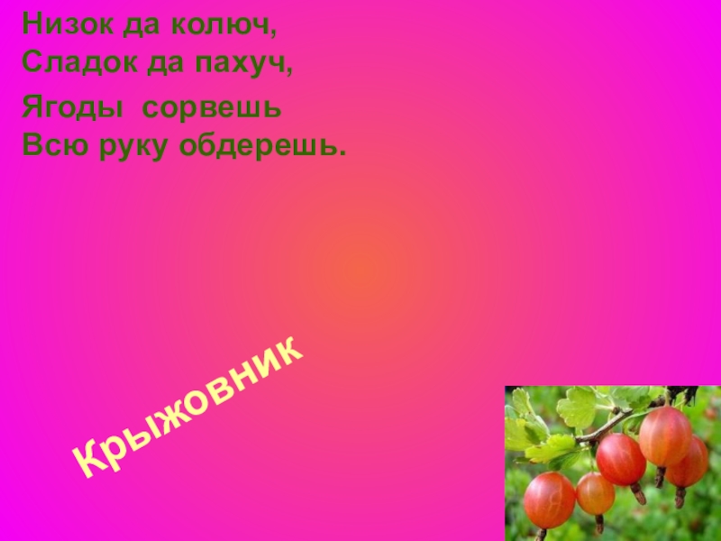 Крыжовник  Низок да колюч, Сладок да пахуч,Ягоды сорвешь Всю руку обдерешь.