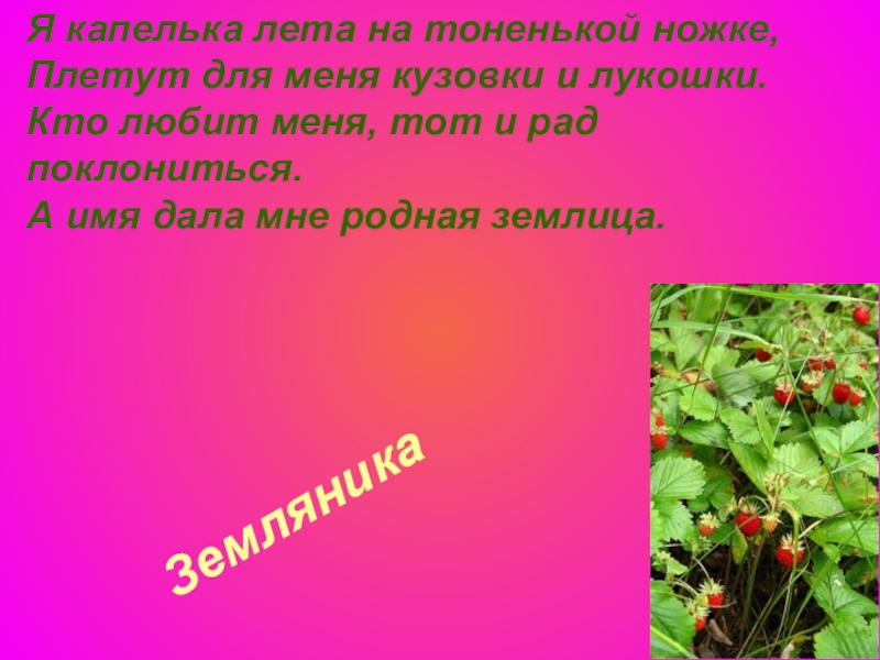 Земляника Я капелька лета на тоненькой ножке, Плетут для меня кузовки и лукошки. Кто любит меня, тот