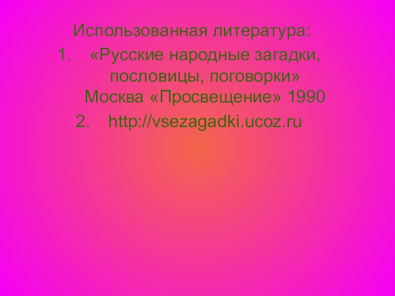 Использованная литература:«Русские народные загадки, пословицы, поговорки» Москва «Просвещение» 1990http://vsezagadki.ucoz.ru