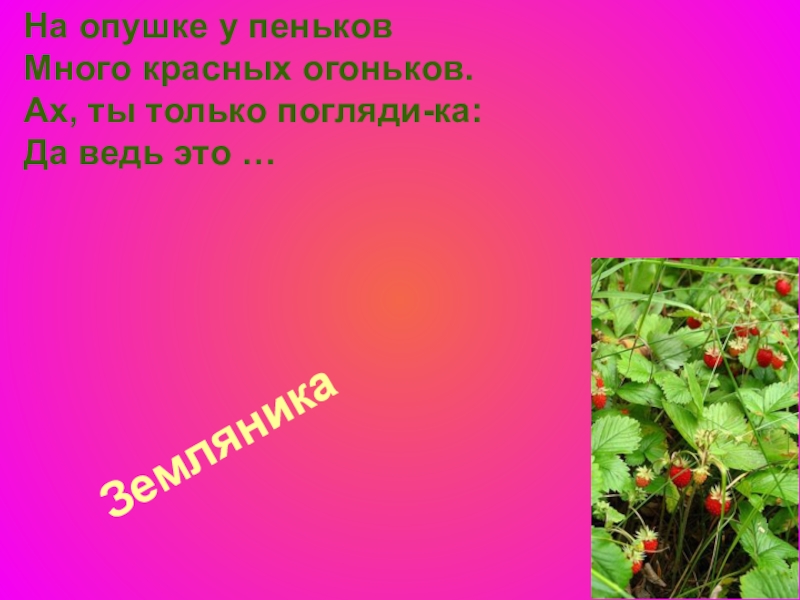Земляника На опушке у пеньков Много красных огоньков. Ах, ты только погляди-ка: Да ведь это …