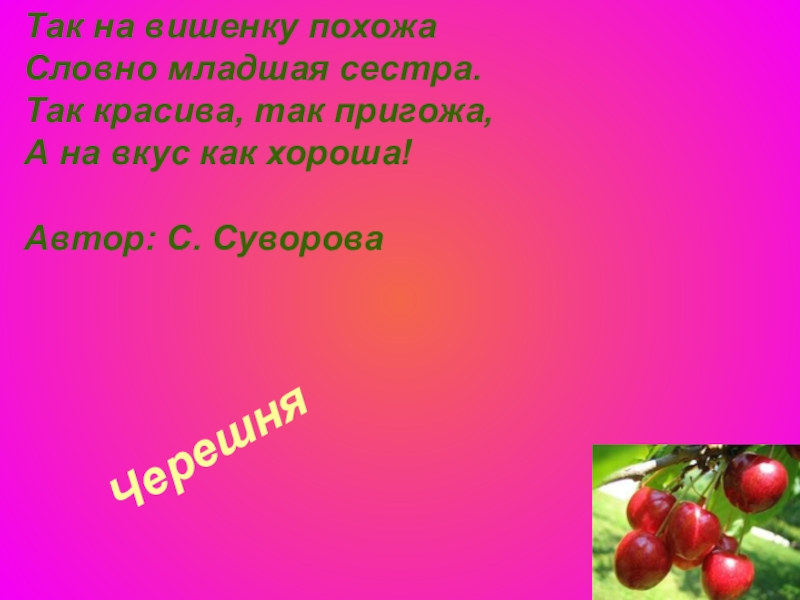 Черешня Так на вишенку похожа Словно младшая сестра. Так красива, так пригожа, А на вкус как хороша!